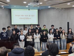 (▲학생부, 대학부, 사청부가 함께 찬송으로 환영하는 모습)