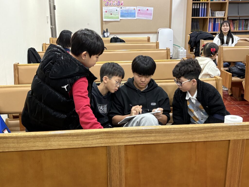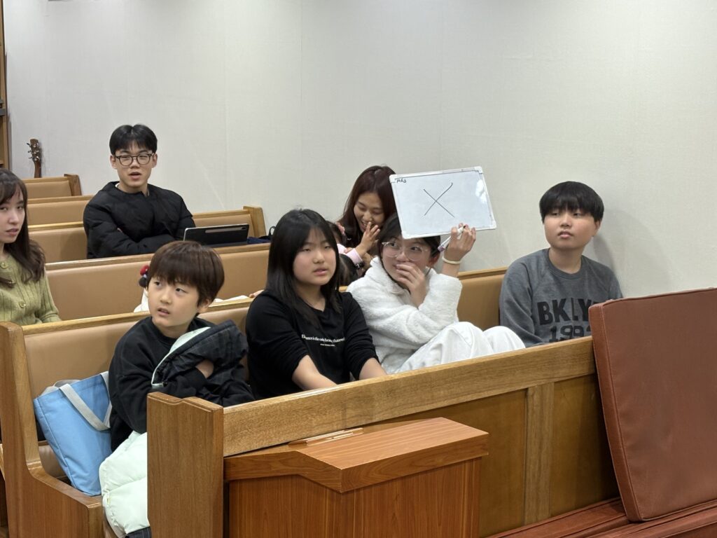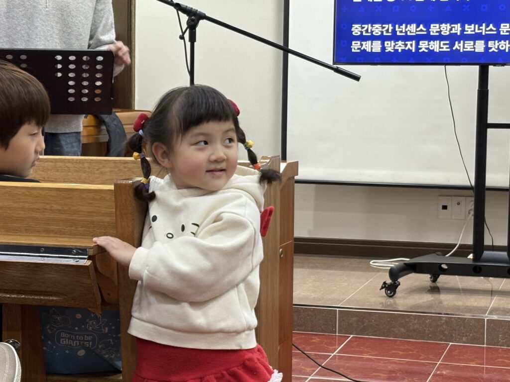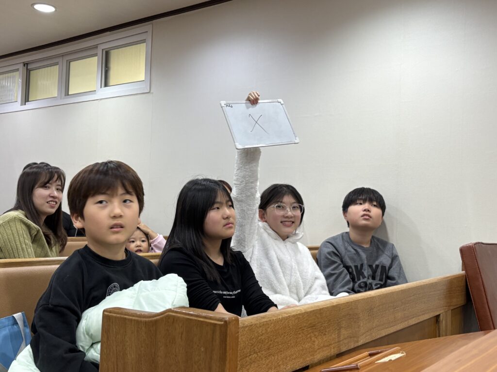 중간중간 등장한 성경 넌센스 퀴즈를 풀기 위해서 노력하는 아이들의 모습도 참 행복해보였습니다. (여러분도 한 번 풀어보세요!    문제: 계속 방어만 하는 성경 인물은?”     정답은 게시글 마지막에 남겨두겠습니다!)