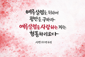 시인은 “예루살렘을 위하여 평안을 구하라”고 권면하며, 그 성을 사랑하는 자가 형통하리라고 선언합니다. 예루살렘을 사랑한다는 것은 그 평안을 위해 기도하고, 공동체의 복을 구하는 것입니다. 또한 국가의 평안이 거져 오는 것이 아니라 누군가의 헌신과 희생으로 오듯이, 사랑한다면 묵묵히 맡겨주신 일을 감당해야하는 것입니다.